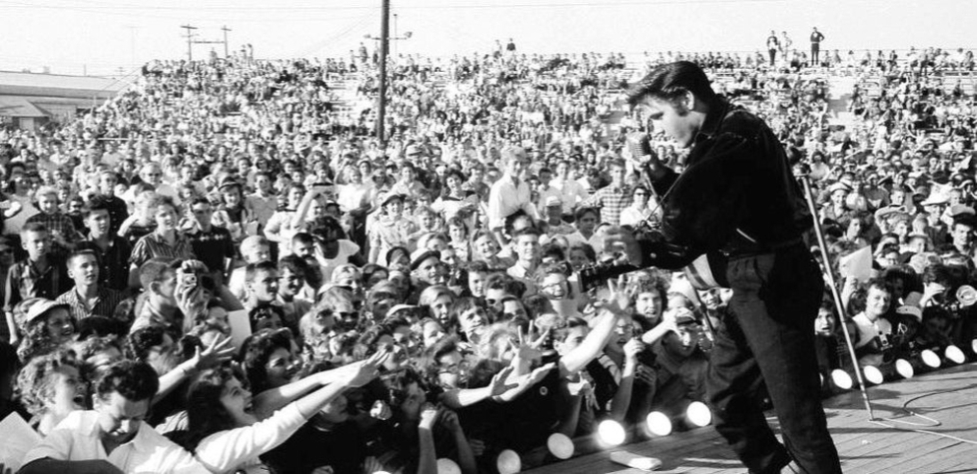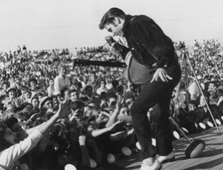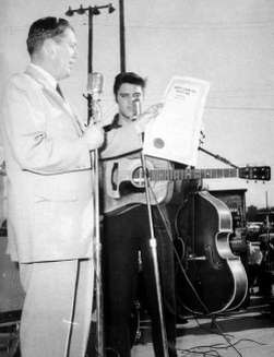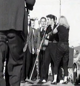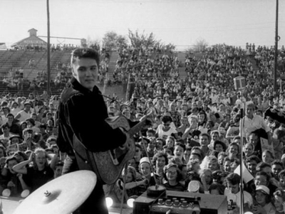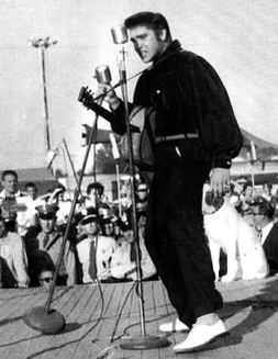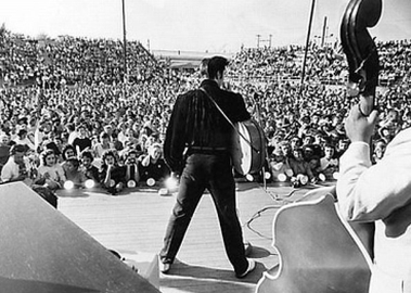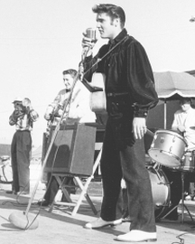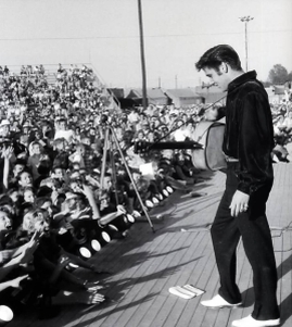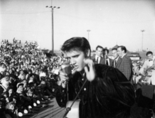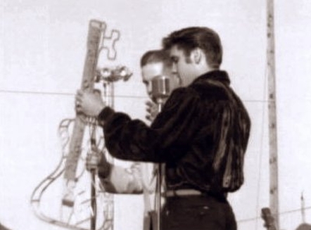 Elvis Presley live bei der „Mississippi-Alabama Fair And Dairy Show“ auf der Open Air-Bühne des „Tupelo Fairground“ in seiner Geburtsstadt Tupelo/Mississippi, Mittwoch, 26. September 1956, Nachmittagskonzert. Elvis trägt ein tief dunkelblaues Samthemd von „Lansky’s“ mit schwarzer Hose und singt vor 20 000 Fans (ausverkauft). In seiner Show bringt Elvis seine rekordbrechenden Millionen-Hits des Jahres sowie aktuelle Album-Songs und wird begleitet von seiner regulären Band „The Blue Moon Boys“ mit Scotty Moore (Leadgitarre), Bill Black (Bass) und D. J. Fontana (Schlagzeug) sowie dem Back-Up-Chor „The Jordanaires“. Während des Auftritts erhält Elvis von Tupelos Bürgermeister James Ballard einen symbolischen Stadtschlüssel in Gitarrenform. Später schafft es eine besonders begeisterte Blondine, auf die Holzbühne zu klettern und kurz bis zu dem jungen Rock’n’Roll-König vorzudringen. Am Abend sind zum zweiten Konzert noch einmal 20 000 Menschen auf dem Gelände, und Elvis spendet seine gesamte Gage in Höhe von 10 000,- Dollar der Stadt, die er 1948 als 13-Jähriger zusammen mit seinen Eltern verlassen hatte, um in Memphis/Tennessee eine bessere Zukunft zu finden. Seine Rückkehr für einen Tag an diesem 26. September 1956 ist für die Stadtoberen von Tupelo Anlass genug, den Tag zum „Elvis Presley Day“ auszurufen.