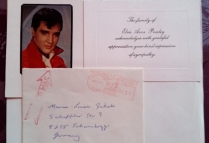 Es war im Jahr 1960: Als Teenager wurde ich langsam zur regelmäßigen Leserin der Jugendzeitschrift „Bravo“. Da, wo vorwiegend Lex Barker, Freddy Quinn, Rex Gildo usw. vertreten waren, tauchte immer wieder auch ein gewisser Elvis Presley auf. Die Bilder von ihm waren toll, der Typ gefiel mir, mehr war da aber anfangs nicht. Als dann später die „Beatles“ kamen, wurde ich für einige Jahre total in deren Bann gezogen. Und doch habe ich immer wieder versucht, auch alles zu erfahren, was über Elvis geschrieben wurde. Als ich 1967 von seiner Hochzeit las, habe ich mich für ihn gefreut. Er hatte das hübscheste Mädchen geheiratet, das man sich vorstellen konnte. Sie passte so gut zu ihm. Priscilla habe ich beneidet. Mit dem 1968er „Comback-Special“ gewann Elvis dann mein Herz vollends. Umso trauriger war ich, als seine Ehe 1973 geschieden wurde. Ich fragte mich, wie kann eine Frau diesen tollen Mann verlassen. Heute dagegen verstehe ich besser, warum Priscilla ihr Leben nicht länger mit Elvis teilen konnte. Im selben Jahr stand für mich durch „Aloha From Hawaii“ fest, dass Elvis trotz der Scheidung immer noch mitten im Leben stand. Er begeisterte die Fans weltweit mit dieser grandiosen Show. Für mich war er spätestens ab da absolut der Größte. Elvis gehörte einfach zu meinem Leben, so wie er auch zum Leben einer Kollegin in meiner Firma gehörte, was ich da aber noch gar nicht wusste. Als ich am 17. August 1977 morgens in die Firma kam, fand ich diese Kollegin weinend vor. Ich dachte zunächst, in ihrer Familie sei vielleicht etwas Schlimmes geschehen. Als sie auf meine Frage allerdings antwortete „Ja, weißt Du es denn noch gar nicht, Elvis ist gestorben“, war ich völlig platt. Also war auch sie ein Fan. Zugleich traf die Nachricht mich wie ein Hammer! Von da an waren es Zwei, die in der Firma weinten, wenngleich von den Anderen belächelt. Es machte uns nichts aus. Wir waren bis dahin nicht so eng miteinander gewesen, aber plötzlich verband uns etwas, die Trauer um Elvis. Diese Verbindung hielt über Jahre. Im vergangenen Jahr habe ich die Kollegin wieder getroffen, wir hatten uns bestimmt 10 Jahre nicht gesehen. Aber das Erste bei unserem Wiedersehen war: „Weißt Du noch, wie wir zusammen über den Tod von Elvis geweint haben?“ Ab jenem August-Tag im Jahr 1977 war es jedenfalls endgültig um mich geschehen. Von da an galt für mich nur noch, alles über Elvis zu sammeln, was ich nur bekommen konnte. Jedes Bild, jeden Zeitungsartikel, alles habe ich ausgeschnitten und fein säuberlich in Ordnern gesammelt. Neun Ordner wurden es, die ich mit der Zeit anlegte. Während dessen lag mein Mann mit einem komplizierten Beinbruch für längere Zeit im Krankenhaus. Meine Tage sahen damals so aus: Krankenbesuch, danach Plattenläden. Ich habe sie alle abgeklappert, um nur ja jede verfügbare Platte zu bekommen. An den Abenden bin ich in jedes Kino gegangen, ob in meiner Stadt oder irgendwo anders. Ich fuhr überall hin, wo ein Elvis-Film gezeigt wurde. Bis dahin hatte ich ihn ja kaum gesehen. Zugegeben, manche Filme fand ich im Nachhinein blöd. Einige wenige jedoch waren wirklich gut. Elvis selbst hat ja einmal gesagt, dass ihn im Lauf der Zeit die öden Drehbücher fast krank gemacht haben. Für mich gab es damals nur Elvis und nichts als Elvis. Fast hätte ich darüber meinen Mann ein bisschen vernachlässigt. Aber Eines ist sicher, diese Begeisterung hat mir in dieser Zeit auch über viele Sorgen wegen des schlimmen Unfalles meines Mannes hinweggeholfen. Seit dieser Zeit hüte ich übrigens auch einen besonderen Schatz: Eine Dankeskarte der Familie Presley auf meinen Kondolenzbrief. Ich hatte damals das Bedürfnis, meine Trauer und meinen Schmerz über Elvis’ Tod auch gegenüber der Familie zum Ausdruck zu bringen. Mir war klar, dass solche Schreiben sicher zu Tausenden in Graceland eingehen würden, und ich war nicht sicher, ob meinen Brief jemals jemand lesen würde. Doch eines schönen Tages war sie da, die Antwort aus Graceland! Die Familie bedankte sich! Ich war und bin darüber noch heute überglücklich. Ich habe etwas, das von dort kommt, wo Elvis zu Hause war! Elvis hat mein Leben aber auch noch auf eine andere Weise grundlegend verändert. Er war der Grund dafür, dass ich Englisch lernte. Ich wollte einfach seine Texte verstehen. Und schließlich haben meine Englischkenntnisse mir in der Firma den Job der Auslandskorrespondentin ermöglicht. Dank Elvis! Leider kam ich allerdings zu spät in die USA, um mit meiner dort lebenden Cousine (die Elvis schon getroffen hatte!) ein Konzert des King zu besuchen. Doch in Las Vegas wollte ich mich Elvis trotzdem so nahe wie möglich fühlen. Wir standen damals vor dem „Hilton Hotel“, und ich wäre zu gerne hineingegangen. Leider mussten wir im Bus der Stadtrundfahrt sitzen bleiben, weil lediglich noch ein paar Gäste zustiegen, bevor es weiterging. So blieb mir nur, auf all die Fenster zu schauen und mich zu fragen, wo denn Elvis zu Lebzeiten wohl gewohnt hatte. Aber der Gedanke allein war schon schön: Hier war Elvis gewesen! Während der nächsten Tage ließ ich es mir nicht nehmen, das „Aladdin“ zu besuchen. Nichts hielt mich davon ab, auch nicht mein Mann, der meinte: „Die lassen uns da doch gar nicht hinein.“ Haben sie doch! Ich habe mir alles angesehen, und da war dieses Gefühl noch stärker: Ich war da, wo Elvis schon gewesen war, ja sogar dort, wo er geheiratet hatte! Toll, das war ein schönes Gefühl! In Deutschland habe ich einige Imitatoren gesehen. Es war irgendwie aufregend, und ich tat auch, was viele Fans während einer Show machten: Ich ging an die Bühne, bat um seinen Schal und bekam einen Kuss. Über der Freude stand allerdings die Traurigkeit, weil ich wusste, es war eben nicht Elvis, und mit ihm würde ich das niemals mehr erleben können. Im Lauf der letzten 50 Jahre habe ich stapelweise Bildbände gesammelt, habe 9 Filme von Elvis auf DVD gekauft, viele Bücher über ihn ge