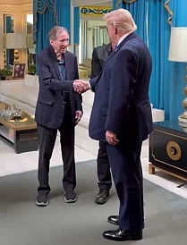 Am gestrigen Montag, dem 23. März 2026, hat US-Präsident Donald Trump der Elvis-Villa Graceland in Memphis einen überraschenden Blitz-Besuch abgestattet. Trump ist erst der zweite amtierende Präsident der USA nach George W. Bush im Jahr 2008, der während seiner Amtszeit das Anwesen des King besuchte. Donald Trump war anlässlich einer Sitzung der „Memphis Safe Task Force“ in Elvis’ Heimatstadt am Mississippi gereist und hatte offenbar kurz vorher den Graceland-Besuch arrangieren lassen. Bereits während der Pressekonferenz nach der Sitzung sprach der bekennende große Elvis-Fan freudig davon, im Anschluss endlich Graceland besuchen zu können, da er dort noch nie zuvor gewesen sei. Am Mittag wurde der US-Präsident dann tatsächlich im Wohnzimmer der Villa von Jack Soden, dem Chef von Elvis Presley Enterprises (EPE), Joel Weinshanker vom EPE-Mutterkonzern „Authentic Brands Group (ABG)“ und EPE-Archivleiterin Angie Marchese empfangen (oberes Foto). Schon beim Betreten des Hausflures rief Trump ergriffen aus „Ich liebe Elvis! Wer tut das nicht?!“ Während des folgenden etwa einstündigen Aufenthaltes, der nicht nur vom Sicherheitsteam des Präsidenten sondern auch von einer Heerschar von Fernseh-Teams und Journalisten begleitet wurde, boten die EPE-Verantwortlichen ihrem spektakulären Gast eine spezielle Führung durch die Räumlichkeiten im Erdgeschoss und Untergeschoss von Graceland wie das Schlafzimmer von Elvis’ Eltern Vernon und Gladys Presley, die Küche, das Billard-Zimmer und den „Jungle Room“. Donald Trump hörte dabei interessiert den Ausführungen von Angie Marchese zu und stellte zwischendurch mehrfach Fragen zu bestimmten Sachverhalten, oder schilderte seine Eindrücke vom Gesehenen (mittleres Foto). Der Besuch gipfelte darin, dass der 79-Jährige feststellte, dass Elvis Presley ohne Zweifel der berühmteste Mensch des Planeten ist. Trump unterstrich zudem, wie fantastisch Elvis’ Musik gewesen sei und brach in der Weise eine Lanze für den King, dass er betonte, wie kompliziert sein Leben ganz sicher gewesen sei. Das Grab von Elvis im Meditationsgarten von Graceland sah sich der US-Präsident offenbar aus Zeitgründen leider nicht mehr an, doch als er am frühen Nachmittag das Anwesen wieder verließ, merkte man Donald Trump an, wie tief ihn der Besuch des Zuhauses seines Idols berührt hatte (unteres Foto). Datum: 23./24. März 2026 – Quellen: Fox News Channel, The Commercial Appeal, Elvis Presley Enterprises (EPE), diverse |