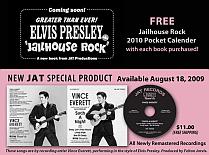 JAT Productions, die Firma von Joseph A. Tunzi, gibt bekannt, dass in Kürze zusätzlich zum angekündigten neuen Foto-Buch „Jailhouse Rock“ auch ein „Jailhouse Rock“-Taschenkalender 2010 veröffentlicht werden wird sowie eine CD-Single mit dem Elvis-Interpreten Vince Everett, auf der zwei von Felton Jarvis produzierte Cover-Versionen von Elvis-Songs („Such A Night“ und „Baby, Let’s Play House“) zu hören sein werden. Datum: 9. August 2009 – Quelle: JAT Productions |