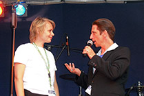 Herrliches Wetter, vielseitiges Programm und begeisterte Fans: Die Elvis-Party 2009 in Leipzig, veranstaltet von Carolin Okon („Elvis Paintings“) und Flower Power in Zusammenarbeit mit „The King’s World“, war ein Volltreffer. Nachdem Autor Christian von Aster eine fantasievolle und amüsante Geschichte zur Einstimmung verlesen hatte, sorgte der Gospel-Chor der Leipziger Thomaskirche für eine erste Gänsehaut. Zum Highlight schlechthin wurde der fulminante und mitreißende Auftritt des Stargastes Peter Kirchberger, der fast 40 Minuten lang zusammen mit der Band „Tom Twist“ Rock’n’Roll vom Feinsten zelebrierte, nachdem er vorher im Interview über seine Karriere als Schauspieler, Rock’n’Roll-Sänger und Elvis’ Synchronsprecher (u. a. in „Stay Away, Joe“, „Change Of Habit“ und „Elvis On Tour“) berichtet hatte. Aber auch Elvis-Interpret Rami und Musical-Star Marc Philip („The Elvis Story“) wussten auf dem Schletterplatz vor den rund 300 Zuschauern zu überzeugen. Und so konnte Carolin Okon, die im Interview mit Moderator Peter Beines ihre Sicht auf Elvis als dessen Malerin schilderte, ein überaus positives Fazit ziehen. Datum: 24. August 2009 |