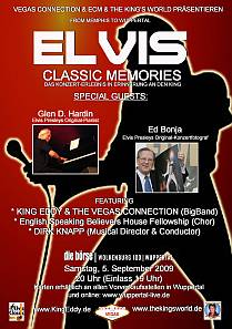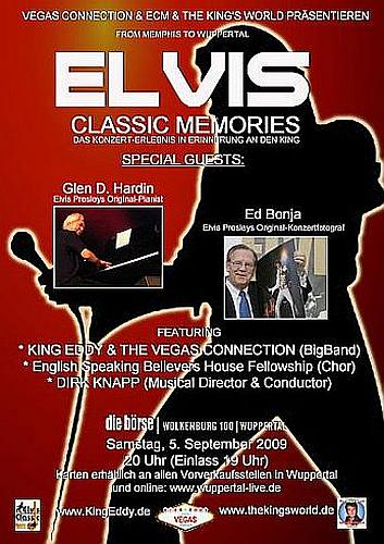 Ein Wechsel des Veranstaltungsortes wurde für „Elvis Classic Memories“ nötig, die erste Großveranstaltung von „The King’s World“, die am 5. September 2009 in Wuppertal in Zusammenarbeit mit ECM und Vegas Connection stattfinden wird. Die Veranstaltung, zu der wir mit dem Pianisten Glen D. Hardin und dem Fotografen Ed Bonja zwei originale Weggefährten von Elvis gewinnen konnten, war ursprünglich im Rex-Theater vorgesehen, findet letztlich aber in der „Börse“ statt, die bis zu 800 Fans Platz bietet. Der Ticketvorverkauf für „Elvis Classic Memories“ beginnt voraussichtlich am Montag, dem 6. Juli. Datum: 2. Juli 2009 |