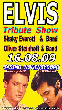 Wie nicht anders zu erwarten war, wird es zu Elvis’ 32. Todestag am Wochenende 15./16. August 2009 wieder ein Stelldichein der deutschen Elvis-Imitatoren geben. Während Rio am 14. August in Kiel und am 15. August in Friedberg gastiert, kann man Oliver Steinhoff und Shaky Everett im Doppel-Pack erleben, und zwar am 15. August ebenfalls in Friedberg sowie am 16. im Casino in Hohensyburg bei Dortmund. Datum: 11. Juli 2009 – Quellen: Diverse |