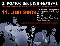 Der 1. Elvis Presley-Club in Mecklenburg-Vorpommern feiert sein 3. Rostocker Elvis-Festival mit 3 Live-Bands, 4 Live-Interpreten und berühmten Freunden aus dem persönlichen Umfeld von Elvis. So sind mit von der Partie die ehemaligen Elvis-Leibwächter Dick Grob und Sam Thompson sowie Ed Bonja (Elvis’ Konzertfotograf von 1970 bis 1975) und Cynthia Pepper, der weibliche Co-Star aus dem Elvis-Film „Kissin’ Cousins“ von 1964. Datum: 25. Mai 2009 – Quelle: Fanclub „1. Elvis Presley-Club Mecklenburg-Vorpommern“ |