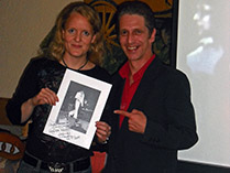 Mit ‚gleich vier Mann hoch’ (Thomas Wagner, Thomas Schwedtmann, Sandra Lohrum und Peter Beines) war das Team von „The King’s World“ beim regionalen Fantreff „Elvis Circle“ in Datteln (bei Recklinghausen) am vergangenen Sonntag, dem 20. September 2009, vertreten. Das Treffen, wie immer von Fan-Urgestein Horst Gerwerth (aktiver Elvis-Fan seit 1956! – Foto oben) mit viel Liebe organisiert, lockte über 30 Besucher an. Bei sommerlichen Temperaturen gab es auf der Terrasse der Location „Die Postkutsche“ ein feines Barbecue, dazu Elvis-Videos auf Großbildschirm und ein Songerkennungsquiz, für das „The King’s World“ den 1. Preis stiftete: Ein Autogrammfoto mit spezieller Widmung an den Gewinner von niemand geringerem als Elvis’ Pianisten Glen D. Hardin, vor zwei Wochen erst Stargast des großen Events „Elvis Classic Memories“ in Wuppertal (Review siehe hier). Stolze Gewinnerin wurde Elvis-Fan Meike aus Bochum, die strahlend den Preis von Peter Beines überreicht bekam (Foto unten). Der nächste „Elvis Circle“ wird am Sonntag, dem 13. Dezember 2009, stattfinden – dann als Weihnachtstreff unter dem Motto „Winter Wonderland“ und wieder in der „Postkutsche“ in Datteln. Datum: 21. September 2009 |