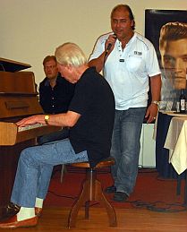 Die Zusammenarbeit von „The King’s World“ und dem holländischen Fanclub „Elvis For Everyone“ machte es möglich: Einen Tag nach seinem Auftritt bei „Elvis Classic Memories“ in Wuppertal kamen auch die Elvis-Fans in den Niederlanden in den Genuss, Elvis’ Pianisten und Arrangeur Glen D. Hardin zu erleben. In Hoogeveen (nahe Zwolle) begann das Programm mit einer ausgedehnten Autogramm- und Fotosession, ehe Glen Hardin im Interview lebendig und authentisch über seine sechsjährige Zeit mit Elvis (1970 bis 1976) berichtete. Durch den Krankheit bedingten kurzfristigen Ausfall des ursprünglich gebuchten Sängers drohte die Veranstaltung ohne Live-Musik über die Bühne zu gehen, hätte nicht Glen Hardin selbst das Problem auf texanisch-direkte Art und Weise gelöst: „Dann müsst Ihr eben singen!“, forderte der Elvis-Pianist lachend und dennoch ganz ernsthaft die Fans auf, mit ihm zu musizieren. Und so konnten einige nicht untalentierte Hobby-Sänger ihr Glück kaum fassen, Songs wie „Bridge Over Troubled Water“ und „I Can’t Stop Loving You“ mit niemand geringerem als eben Glen Hardin live darzubieten. Einige schräge Töne konnten dabei die allgemeine Heiterkeit nicht stören, so dass die entstandenen Sorgenfalten im Gesicht von Clubchef Constantijn Zantingh rasch wieder verflogen waren. Datum: 7. September 2009 |