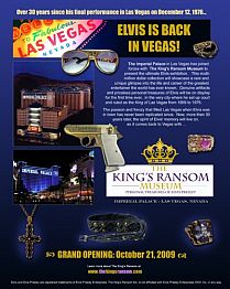 Nach Jahren, in denen diese erstklassig bestückte Ausstellung durch die halbe Welt getourt ist, kehrt „The King’s Ransom Museum“ endlich nach Las Vegas zurück. Die Eigentümer Russ Howe und Bud Glass haben mit dem Hotel- und Casino-Komplex „Imperial Palace“ einen Vertrag unterzeichnet, um Elvis fast 33 Jahre nach seinem letzten Konzertgastspiel im Hilton Hotel (2. bis 12. Dezember 1976) nach Las Vegas zurück zu bringen – wenn auch nur als Fokus einer Ausstellung. Die feierliche Eröffnung ist für den 21. Oktober 2009 vorgesehen. An diesem Tag und in der Folge sind im Imperial Palace viele interessante Veranstaltungen rund um die Ausstellung geplant. Datum: 6. Oktober 2009 – Quelle: Elvis Infonet |