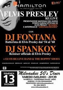 Elvis’ Schlagzeuger der 50er und 60er Jahre D. J. Fontana und Discjockey/Produzent DJ Spankox sind die Stars der Show „Elvis Re:Live“ am kommenden Sonntag, dem 13. Dezember 2009, in der norditalienischen Metropole Mailand. Die von der Firma „Hamilton“ präsentierte Veranstaltung findet im „Milwaukee 50’s Diner“ im Stadtteil Varedo statt und beginnt um 20.30 Uhr. Datum: 8. Dezember 2009 – Quelle: Fanclub „Elvis Unlimited“ |