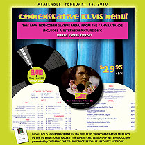Am 14. Februar 2010 wird JAT Productions, die Firma von Joseph Tunzi, ihr neuestes Produkt auf den Markt bringen. Das „Commemorative Elvis Menu“ erinnert an Elvis’ Konzertgastspiel im Mai 1973 im Sahara Tahoe Hotel mit einer originalgetreuen Reproduktion der seinerzeitigen Menükarte, der als Bonus eine Elvis-Interview-Picture-CD beiliegen wird. Elvis war im Jahr 1973 vom 4. bis zum 20. Mai im Sahara Hotel am Lake Tahoe in Nevada für 2 Shows pro Abend gebucht gewesen, hatte nach starken Shows das Gastspiel jedoch am 17. Mai wegen einer schweren Erkältung abbrechen müssen. Datum: 28. Dezember 2009 – Quelle: JAT Productions |