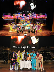 Das Ensemble von „Viva Elvis“ von Cirque Du Soleil feierte ebenfalls Elvis’ 75. Geburtstag. Am Ende der ausverkauften Aufführung vom 8. Januar 2010 wurde eine große Elvis-Torte auf die Bühne des „Aria Resort“ in Las Vegas gebracht und dort angeschnitten. Die Besetzung sang gekonnt „Happy Birthday“ für Elvis, und die 2000 Zuschauer im Theater stimmten fröhlich mit ein. Die Torte, deren Boden aus einer großen Schokoladengitarre bestand, sah lecker aus und schmeckte dem Vernehmen nach auch so. Datum: 12. Januar 2010 – Quelle: Cirque Du Soleil |
