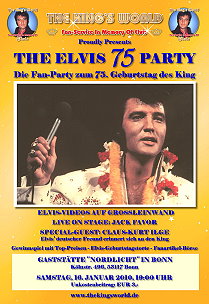 In Bonn freut man sich auf die große „Elvis 75 Party“ von „The King’s World“ am kommenden Samstag, dem 16. Januar 2010, im Gasthaus „Nordlicht“, dessen neuer Pächter Toni Stein gespannt ist auf die Elvis-Fans, die sich aus vielen Teilen Deutschlands angekündigt haben. Stein hat eigens eine spezielle Elvis-Speisekarte für die Gäste entworfen, und für das Elvis-Songerkennungsquiz stehen wertvolle Preise zu Verfügung. Die Elvis-Geburtstagstorte ist bereits in Vorbereitung, Elvis-Darsteller Jack Favor hat zwei fulminante Live-Sets geplant, Ehrengast Claus-Kurt Ilge wird lebendig und authentisch wie eh und je von seinen zahllosen Begegnungen mit Elvis berichten, und was das wichtigste ist: Der King wird höchstpersönlich von der Videoleinwand seine größten Hits und schönsten Songs vortragen. Die Party beginnt um 19.00 Uhr, der Unkostenbeitrag beträgt lediglich EUR 3,-. Datum: 14. Januar 2010 |
