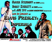Wie angekündigt befinden sich Elvis’ Imperials (ehem. „The Imperials Quartet“), der frühere Begleitchor von Elvis aus den Jahren von 1966 bis 1971, an diesem Wochenende auf einer Kurztournee durch Deutschland. Nach einem Konzert mit „The King“ alias Jim Brown in der Soester Stadthalle am gestrigen Abend folgen heute und morgen noch Shows mit „Dr. Kingsize“ in München und mit Oliver Steinhoff und Shaky Everett im Casino Hohensyburg in Dortmund. Elvis’ Imperials bestreiten die Auftritte mit den Original-Mitgliedern Terry Blackwood und Joe Moscheo, dem späteren Mitglied Sherman Andrus (seit 1971) und Neu-Mitglied Aaron Odom (seit 2009, nicht auf dem Foto). Datum: 5. Juni 2010 – Quellen: Diverse |