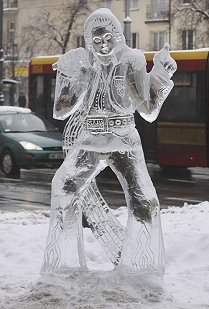 Manchmal hofft man dann ja doch, dass der Winter bleibt, der Schnee nicht taut und das Eis nicht schmilzt. In der polnischen Hauptstadt Warschau kann man mitten im Zentrum diese von Fans gebastelte Elvis-Eisskulptur bewundern. Ein wundervolles Kunstwerk, das schöner und stilvoller ist als so manche der teilweise seltsamen Elvis-Statuen, die man rund um den Globus findet. Datum: 13. Januar 2010 – Quelle: Fanclub „Elvis Matters“ |