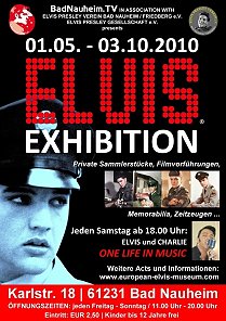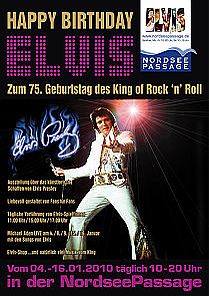 Eine liebevolle Elvis-Würdigung mit Stil und Niveau findet gegenwärtig in der norddeutschen Hafenstadt Wilhelmshaven statt. Dort ist in der „Nordsee-Passage“, dem größten Einkaufscenter der Stadt, seit dem 4. Januar 2010 die Ausstellung „Happy Birthday, Elvis“ zu sehen, die von Ulrich und Barbara Elter aus Oldenburg zusammengestellt wurde. Tägliche Elvis-Filmvorführungen und mehrere Live-Shows des Elvis-Imitators Michael Aden werden als Rahmenprogramm angeboten. Die Aktion läuft noch bis zum Samstag der nächsten Woche, also dem 16. Januar 2010. Ulrich Elter ist Autor des Buches „Der King in Deutschland 1958-1960“, das im Jahr 2008 im B + U-Verlag publiziert worden war. Datum: 7. Januar 2010 – Quelle: Ulrich Elter/B + U-Verlag |