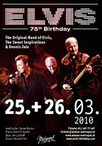 Das Interesse, das die Konzerte von Elvis’ TCB Band und Elvis’ Begleitchor „The Sweet Inspirations“ mit Elvis-Interpret Dennis Jale ab nächster Woche in Österreich erwecken („The King’s World“ berichtete), ist offenbar immer noch nicht befriedigt. Und so wird es am 25. und 26. März 2010 zwei weitere Shows in dieser Besetzung geben, die erneut im „Metropol“ in der Hauptstadt Wien stattfinden werden. Datum: 11. Januar 2010 – Quelle: Dennis Jale |