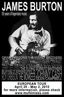 James Burton, Gitarren-Ikone der US-Musikszene und Lead-Gitarrist bei Elvis in der Konzert-Ära der Jahre 1969 bis 1977, geht im kommenden Frühling auf Europa-Tournee! Die Tour wird durch die Niederlande und Belgien sowie in die Schweiz führen. Tourstart ist am 20. April 2010 in Goirle in den Niederlanden, das Abschlusskonzert wird am 2. Mai 2010 in Tilburg ebenfalls in den Niederlanden sein. Der detaillierte Tour-Plan soll in Kürze veröffentlicht werden. James Burton wird die Tournee mit der 7-köpfigen niederländischen Band „The Mufkin Tass“ bestreiten und bei den Shows auch aber nicht nur Elvis-Titel spielen. Weitere Informationen folgen. Datum: 19. Januar 2010 – Quelle: The Mufkin Tass |