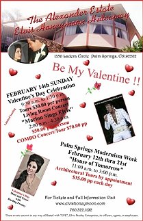 Wer Graceland am Valentinstag, dem 14. Februar 2010, besucht, kann dort ein spezielles „Love Me Tender Valentine’s Day Package“ für zwei Personen buchen. Das Paket besteht aus einer Übernachtung im „Heartbreak Hotel“, Tickets für die „Graceland Platinum Tour“, feinen Pralinen in einer herzförmigen Schachtel, der CD „Love, Elvis“ und einem roten Elvis-Teddy Bär. Datum: 23. Januar 2010 – Quelle: Elvis Presley Enterprises (EPE) |