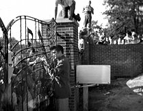 Eine EPE-Mitarbeiterin namens Angie Marchese hat beim Sichten von Unterlagen aus dem früheren Büro von Elvis’ Vater Vernon in Graceland drei Fotos gefunden, die bislang noch völlig unbekannt waren und nie veröffentlicht worden sind. Die Fotos zeigen Elvis mit Fans am Music Gate von Graceland im Jahr 1957. Kurioser Weise war ein viertes Foto aus der Serie bereits vor Jahren aufgetaucht, ehe jetzt die weiteren Bilder gefunden wurden. Nicht bekannt sind zumindest bislang das genaue Aufnahmedatum und der Fotograf. Jedoch können die Fotos erst nach dem 26. April 1957 entstanden sein, da erst an diesem Tag das Music Gate installiert worden war, nachdem Elvis die Villa im März 1957 gekauft hatte. Datum: 1. Juli 2010 – Quelle: Elvis Presley Enterprises (EPE) |