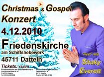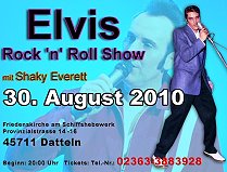 Einen seiner nächsten großen Auftritte wird der bekannte deutsche Elvis-Imitator Shaky Everett am Montag, dem 30. August 2010, in Datteln bei Recklinghausen haben, in der Stadt also, in der auch der beliebte Elvis-Fantreff „Elvis Circle“ regelmäßig stattfindet. In seiner neuen Heimatstadt will Shaky Everett mit seinem Konzert Elvis’ 33. Todestag besonders würdigen. Die Show findet in der Friedenskirche am Schiffshebewerk in der Provinzialstr. 14-16 statt und beginnt um 20.00 Uhr. Karten zum Preis von 13,50 EUR sind erhältlich unter der Ticket-Hotline 02363 - 388 39 28. Datum: 26. Juli 2010 – Quelle: Shaky Everett |
