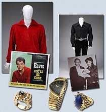 Wie angekündigt hat am vergangenen Freitag und Samstag, dem 3. und 4. Dezember 2010, in Beverly Hills/California die Versteigerung „Icons And Idols“ von „Julien’s Auctions“ stattgefunden. Von Elvis kam eine Vielzahl von Stücken unter den Hammer, die überwiegend hohe Preise erzielten. So wurden für ein von Plattencover-Fotos bekanntes rotes Sweatshirt 90 000,- Dollar gezahlt und für eine schwarze Hemd-/Hose-Kombination mit silbernem Gürtel aus Elvis’ privater Garderobe der 70er Jahre 25 000,- Dollar. Zwei goldene Ringe von Elvis erzielten jeweils 12 800,- Dollar und seine goldene „Hamilton Ventura“-Armbanduhr 12 500,- Dollar. Ein „Colt“-Revolver aus dem stattlichen Waffenarsenal des King kam auf 8750,- Dollar, während für sein persönliches Kempo-Karatebuch immerhin noch 5000,- Dollar geboten wurden. Zahlreiche weitere Stücke aus Elvis’ früherem Besitz oder solche, die anderweitig mit ihm in Verbindung stehen wie ein „Summer Festival“-Werbebanner aus dem Las Vegas Hilton Hotel (2880,- Dollar) und eine LP „King Creole“ mit Original-Autogramm (1280,- Dollar), erzielten ebenfalls hohe Summen. Datum: 7. Dezember 2010 – Quelle: Julien’s Auctions |