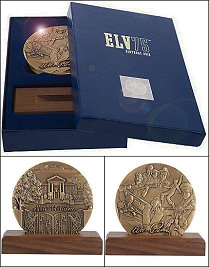 Etwas spät dran sind sie damit ja schon: Elvis Presley Enterprises (EPE) in Memphis bietet seit einiger Zeit eine hochwertig gestaltete Erinnerungsmedaille in exklusiver Verpackung an, die dem 75. Geburtstag von Elvis im Januar 2010 gewidmet ist. Die Medaille ist aus Bronze gefertigt und zeigt auf der einen Seite Elvis’ Villa Graceland mit dem Schriftzug „January 8, 2010 – 75th Birthday“ und auf der anderen Seite Darstellungen der Höhepunkte aus Elvis’ Leben und Karriere sowie Elvis’ Unterschrift. Verpackt ist die Medaille, zu der noch ein Aufsteller aus Haselnussholz gehört, in einer blauen Schachtel mit samtblauem Einsatz als augenzwinkernde Anspielung auf Elvis’ Song-Klassiker „Blue Suede Shoes“. EPE bietet das Set, das regulär stolze 125,- Dollar kostet, gegenwärtig für 49,95 Dollar an. Datum: 2. Juli 2010 – Quelle: Elvis Presley Enterprises (EPE) |