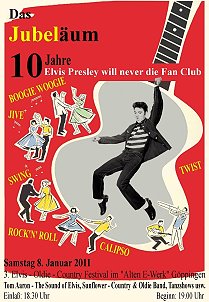 Am kommenden Sonntag, dem 12. Dezember 2010, ist es soweit: Fan-Urgestein Horst Gerwerth und der Fankreis „Elvis Never 4get“ übergeben bei der diesjährigen Weihnachtsauflage den Fantreff „Elvis Circle“ freundschaftlich an „The King’s World“. Ab 15.00 Uhr wird es in der beliebten Location „Zur Postkutsche“ in der Castroper Str. 176 b in 45711 Datteln bei Recklinghausen bei wieder freiem Eintritt rare Elvis-Videos auf Leinwand, Elvis-Hits von CD, gut bestückte Verkaufsstände, leckeres Essen zu fairen Preisen und nette Gespräche von Fan zu Fan geben. Dazu werden ein letztes Mal Spenden gesammelt werden für den Dattelner Tierschutzverein, deren Vorsitzende sich zum Empfang der Spardose persönlich angekündigt hat. Entgegen Meldungen, die offenbar gezielt einen anderen Eindruck zu erwecken versuchten, wird der Fantreff „Elvis Circle“ wie bereits angekündigt im Jahr 2011 in gleicher Weise wie bisher und an gleicher Stelle von „The King’s World“ weitergeführt werden, nachdem wir in den letzten eineinhalb Jahren die Initiativen von Horst Gerwerth bereits immer gerne und tatkräftig unterstützt hatten. Zudem wird der gebürtige Bremer, der die beliebteste regionale Elvis-Veranstaltung Westfalens 10 Jahre lang geleitet hatte, dem Event in beratender Funktion und als Stammgast erhalten bleiben. Datum: 9. Dezember 2010 |