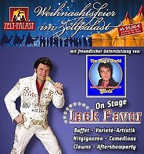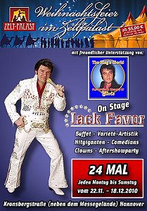 In Hannover ist am vergangenen Wochenende unter tosendem Applaus die von „The King’s World (TKW)“ unterstützte dreieinhalbwöchige Gala-Show-Reihe „Weihnachten im Zeltpalast“ zu Ende gegangen. Seit dem 25. November 2010 hatten an jeweils sechs Abenden pro Woche Artisten, Jongleure, Feuerkünstler und Clowns das Publikum bestens unterhalten. Top-Act jedes Abends war jedoch Deutschlands Spitzen-Elvis-Darsteller Jack Favor, der stets als letzter auf die Bühne ging und mit einer furiosen Elvis-Tribut-Show in originalgetreuen Jumpsuits nicht nur die Stimmung auf den Höhepunkt trieb, sondern auch mit seinen Mitteln ein würdiges Andenken an den King zelebrierte, welches von den überwiegend aus Nicht-Elvis-Fans bestehenden Besuchern bemerkenswert gut angenommen wurde. Zwanzig bis dreißig Minuten dauerten die Auftritte Jack Favors jeweils, in denen der Wahl-Hamburger stets einen feinen Querschnitt durch Elvis’ musikalisches Schaffen darbot, ehe auf der allabendlichen Aftershow-Party dann wieder andere Töne erklangen. Am Ende konnten alle Beteiligten ein überaus positives Fazit ziehen: Der Veranstalter „Tentfox“ freute sich über ein trotz der schlechten Witterung stets sehr gut besuchtes und oftmals komplett ausverkauftes Zelt. Jack Favor freute sich, einmal mehr beim Publikum gut angekommen zu sein, und „The King’s World“ (dessen Mitarbeiter Jack Favor alias Franz Nübel bekanntlich ist) konnte eine weitere schöne Veranstaltungskooperation in guter und angenehmer Atmosphäre durchführen. Unser herzliches Dankeschön gilt deshalb besonders der Familie Huppertz als Betreiber des Unternehmens „Tentfox“ für die jederzeit ausgezeichnete Zusammenarbeit! Datum: 20. Dezember 2010 |
