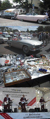 Neben dem musikalischen Hauptevent mit dem Konzert von Suzi Quatro, den Searchers und „Play Off“ am Freitagabend bot das Oldie-Open Air-Festival „Rheinbach Classics“ am Wochenende vom 16. bis zum 18. Juli 2010 ein vielfältiges, abwechslungsreiches und herrlich nostalgisches Programm und ließ die 50er, 60er und 70er Jahre auf wunderbare Weise wieder aufleben. Vor allem die Oldtimer-Rallye am Samstag und die große Oldtimer-Präsentation mit Korso durch die Stadt am Sonntag lockten nicht nur Automobil-Freaks an und begeisterten die Besucher, die sich an den wunderbar gepflegten Cadillacs, Buicks, Oldsmobiles, Lincolns, Ford Mustangs und Chevrolet Corvettes, aber auch Porsche 911ern und diversen Mercedes-Modellen gar nicht satt sehen konnten. Auf dem Nostalgie-Markt konnten die Oldie-Fans stundenlang nach Schallplatten und CDs, aber auch nach Autoteilen und -zubehör, Kleidungs- und Schmuckstücken, Haushaltsartikeln, Spielwaren, Büchern und Souvenirs aus alten Tagen stöbern. Musikalisch ging es auf mehreren Bühnen so richtig ab, wobei vor allem die Gruppe „The Jukeboys“ am Sonntagmittag gewaltig abräumte, indem sie über eine Stunde lang fast nur Elvis-Songs spielte und mit erstklassigen Cover-Versionen von Titeln von „See See Rider“ bis „Love Me Tender“ das Publikum zu Beifallsstürmen hinriss. Doch auch Bands wie „The Rocketeers“, „The Hickory Cats“, „The Time Bandits“ oder „Pete Louis & Die scharfen Karpfen“ überzeugten und ließen immer wieder mal Songs vom King erklingen. Ebenfalls in Rheinbach mit dabei waren natürlich auch die mit „The King’s World“ befreundeten „Boogie Friends NRW“, die mit ihren Tanzeinlagen einmal mehr beeindruckten. Das Wichtigste aber war, dass das Wetter perfekt mitspielte und mit herrlichem Sonnenschein bei keinem einzigen Tropfen Regen die vielen Tausend Oldie-Fans verwöhnte, die von überall her nach Rheinbach gekommen waren, so dass „Rheinbach Classics“-Vorsitzender Heinz Haubrichs am Ende ein sehr zufriedenes Fazit ziehen konnte. Datum: 20. Juli 2010 |