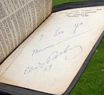Eine Bibel aus Elvis’ früherem Besitz ist eines der interessantesten Stücke auf einer Bibel-Ausstellung, die gerade in der Stadt Southport im Nordwesten Englands angelaufen ist. Die Elvis-Bibel trägt im Innern auf der letzten Seite eine mit blauem Kugelschreiber geschriebene handschriftliche Eintragung von Elvis aus dem Jahr 1959, die „I Love Ya, Mama“ lautet und von Elvis offenbar unter dem Eindruck des noch nicht lange zurückliegenden Todes seiner Mutter Gladys am 14. August 1958 geschrieben worden war. Die Ausstellung, in der eine große Anzahl von historisch bedeutsamen Bibeln gezeigt wird, ist in der „Wayfarers Shopping Arcade“ in Southport zu sehen und läuft noch bis zum kommenden Mittwoch, dem 6. Juli 2011. Die Bibeln stammen alle aus „London’s Museum Of The Book“. Datum: 1. Juli 2011 – Quelle: Stadt Southport, Fanclub „Elvis Matters“ |