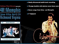Zeitgleich zu den Detail-Informationen zur kommenden Buch-/CD-Kombination „Fashion For A King“ hat das offizielle Sammlerlabel „Follow That Dream Records (FTD)“ seine zur Veröffentlichung im September 2011 vorgesehenen neuen Produkte vorgestellt. Demnach stehen an: CD „48 Hours To Memphis“ mit einem bearbeiteten Soundboard-Mitschnitt des Tournee-Konzertes im „Richmond Coliseum“ in Richmond/Virginia am 18. März 1974, das langjährige Sammler allerdings in genau dieser Form schon von der sehr guten Bootleg-CD „Guaranteed To Blow Your Mind“ des inoffiziellen Labels „Luxor“ aus dem Jahr 1997 kennen; Doppel-CD „He Touched Me“, eine Wiederveröffentlichung von Elvis’ Gospel-Album-Klassiker vom April 1972 inklusive seltener Session-Outtakes; Doppel-LP „Elvis Sings Guitar Man“, eine Deluxe-Vinyl-Ausgabe der gerade erst im April dieses Jahres 2011 veröffentlichten gleichnamigen Doppel-CD mit Studio-Aufnahmen und Session-Outtakes aus den Jahren 1966/67. Datum: 20. Juli 2011 – Quellen: Follow That Dream Records (FTD), Fanclub „It’s Elvis Time“ |