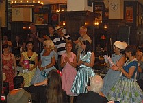 Zu einem schönen Erfolg ist die Veranstaltung „Köln der 50er: Petticoats und Cadillacs“ geworden, die die Agentur „La Colonia Promotions“ mit Unterstützung von „The King’s World (TKW)“ wie angekündigt am vergangenen Sonntag, dem 10. Juli 2011, in Köln durchgeführt hat. Rund 400 Oldie-Freunde, Rock’n’Roll-Freaks, und Elvis-Fans besuchten den Tag über bei freiem Eintritt das Event im traditionsreichen Wirts- und Brauhaus „Gaffel am Dom“ im Herzen von Köln. Schon vor der Location sorgte eine stattliche Sammlung wundervoll gepflegter Cadillacs, Buicks, Chevrolets und Ford aus den 50er Jahren für ein stilechtes Ambiente (oberes Foto). Drinnen stimmten sich die ersten Besucher schon ab 11.00 Uhr vormittags auf das weitere Geschehen ein, bei dem ab 12.00 Uhr erstmals die Stimmung hoch kochte, als die in großer Besetzung mit Back-Up-Sängerinnen und Bläsern erschienene Rock’n’Roll-Cover-Band „The Rocking Maniacs“ den ersten von drei Live-Sets spielte (zweites Foto). Anschließend trat Lokalmatador Lutz Lager in Aktion: Der vor allem in der Domstadt seit langem bekannte und beliebte Rock’n’Roll- und Country-Sänger und Elvis-Interpret bot im Halbplayback-Verfahren viele Songs aus den 50er und 60er Jahren dar, darunter überwiegend Elvis-Titel wie „Don’t Be Cruel“, „All Shook Up“, „I Need Your Love Tonight“, „Stuck On You“, „Good Luck Charm“ und zum Abschluss „Can’t Help Falling In Love“. Zwischendurch holte Lutz Lager Peter Beines von „The King’s World“ zu einem rund 20-minütigen Interview auf die Bühne, bei dem es ausführlich um Elvis und um die vielfältigen Aktivitäten von „The King’s World“ ging (drittes Foto), was gleich mehrere Besucher dazu motivierte, sich beim TKW-Stand als Stammgast bei uns anzumelden. Zum Ende hin wurde es dann noch einmal richtig spannend, als Organisator Kay Passmann von „La Colonia Promotions“ unter reger Anteilnahme der Fans die Wahl zur „Miss Petticoat“ präsentierte (unteres Foto). Und so herrschte am Abend, als das vielfältige Event langsam ausklang, große Zufriedenheit bei allen Beteiligten über einen schönen Tag in Erinnerung an die große Zeit von Rock’n’Roll, Petticoats und Cadillacs. Fest steht bereits jetzt, dass nach der gelungenen Premiere die Beteiligten ihre angenehme Zusammenarbeit fortsetzen und im Jahr 2012 weitere Veranstaltungen dieser Art folgen lassen werden. Mehr dazu demnächst an dieser Stelle! Datum: 12. Juli 2011 |