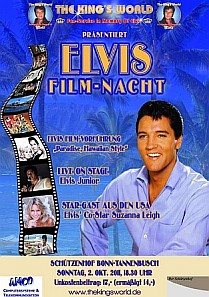 Ein neues großes Event mit prominenter Starbesetzung in Erinnerung an Elvis veranstaltet „The King’s World“ Anfang Oktober 2011 in der Bundesstadt Bonn! Bei der „ELVIS FILM-NACHT“ wollen wir den Schauspieler Elvis Presley würdigen und zugleich das 45-jährige Jubiläum seines 1966er Spielfilms „Paradise, Hawaiian Style“ (dt. Titel „Südsee-Paradies“) feiern. Hierzu ist es uns gelungen, Elvis’ weiblichen Co-Star aus dem Film Suzanna Leigh als Stargast zu verpflichten. Nach der Vorführung des Films auf Großleinwand wird Mrs. Leigh (s. oberes Foto mit Elvis) in einem ausführlichen Interview über Elvis und die Dreharbeiten mit ihm berichten und natürlich auch für Autogramme und Fotos zu Verfügung stehen. Zweiter Stargast des Events ist der belgische Elvis-Darsteller „Elvis Junior“ (unteres Foto), der in einer dynamischen Live-Show einige der großen Hits des King darbieten wird. Dazu gibt es eine große Elvis-Börse mit CDs, DVDs und Fanartikeln aller Art. Location der „ELVIS FILM-NACHT“ ist der beliebte, geräumige und stilvolle „Schützenhof“ im Bonner Stadtteil Tannenbusch, dessen freundliches Team die Besucher mit Speis und Trank zu fairen Preisen versorgen wird. Der Unkostenbeitrag zur „ELVIS FILM-NACHT“ von „The King’s World“ beträgt 17,- Euro pro Person. Einen großen Vorteil genießen auch hier wieder unsere Stammgäste, die lediglich 14,- Euro zu bezahlen brauchen. Als Termin der „ELVIS FILM-NACHT“ haben wir den Vorabend zum Tag der Deutschen Einheit (bundesweiter Feiertag) gewählt: Sonntag, der 2. Oktober 2011. Einlass ist ab 18.00 Uhr. Weitere Infos zur Veranstaltung finden alle Fans auch im Link „Elvis-Events“ unserer Website. Datum: 25. Juli 2011 |