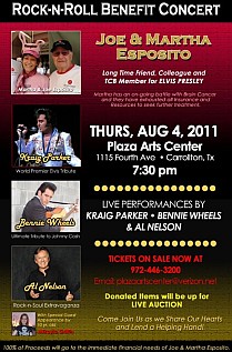 Am 25. Juni 2011 hatten wir hier unseren „Elvis-News“ erstmals über die sehr schwere Erkrankung von Martha Esposito berichtet, der Ehefrau von Elvis’ langjährigem Privatsekretär, Road-Manager und engem Freund Joe Esposito. Martha Esposito leidet schon seit längerer Zeit an einem Hirntumor, der zu einer Schädigung des zentralen Nervensystems geführt hat. In der Fachsprache wird diese Erkrankung als „neoplastische Meningitis“ bezeichnet. Eine Behandlung dieser tückischen Krankheit ist äußerst schwierig und überdies mit immensen Kosten verbunden. Joe und Martha Esposito haben hierfür mittlerweile alle ihre finanziellen Ressourcen aufgebraucht und hoffen nun sehr herzlich auf Unterstützung von den Elvis-Fans. Zu diesem Zweck wird es am Donnerstag, dem 4. August 2011, ab 19.30 Uhr ein Wohltätigkeitskonzert unter dem Titel „Rock’n’Roll Benefit Concert“ geben, das im „Plaza Arts Center“ in Carrollton/Texas (nordwestlich von Dallas gelegen) stattfinden wird. Für die Veranstaltung sind der Elvis-Imitator Kraig Parker, der Johnny Cash-Imitator Bennie Wheels, der Rock- und Soul-Sänger Al Nelson und die erst 10-jährige talentierte Nachwuchssängerin Mikayla Griffin gebucht worden. Neben den Live-Auftritten dieser Künstler soll es auch eine Versteigerung von Musik-Memorabilia geben, für die Sachspenden erbeten werden. Der gesamte Erlös des „Rock’n’Roll Benefit Concert“ wird an Joe und Martha Esposito gehen. Weiterhin offen ist auch das für die Espositos eingerichtete Spendenkonto bei der kalifornischen „Talbert Family Foundation“, im Internet zu finden unter www.talbertfamilyfoundation.org. Datum: 24. Juli 2011 – Quelle: Fanclub „Elvis Unlimited“ |