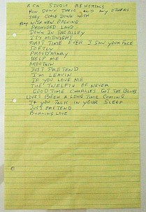 Beim Internetverkaufsportal „e-bay“ ist eine historisch sehr wertvolle handgeschriebene Songliste von Elvis aus dem Jahr 1974 für die hohe Summe von 5999,- US-Dollar per Sofortkauf von einem nicht genannten Sammler erworben worden. Die Liste war von Elvis im Sommer 1974 für eine Probe in den RCA-Studios in Los Angeles am 16. August 1974 geschrieben und seinem Bühnenassistenten Charlie Hodge gegeben worden. Sie dokumentiert, mit welchem Einsatz und Interesse sich Elvis seinerzeit auf die drei Tage später, am 19. August 1974, beginnende neue Sommer-Konzertserie im „Hilton Hotel“ in Las Vegas vorbereitete, bei der der King seinen Fans ein völlig neues Songprogramm vorstellen wollte. Hiefür sollten zahlreiche neue Lieder wie „Promised Land“, „It’s Midnight“, „Your Love’s Been A Long Time Coming“, „Good Time Charlie’s Got The Blues“, „If You Love Me, Let Me Know“, „The Twelfth Of Never“ und „Softly, As I Leave You“ geprobt werden. Dazu sollten noch Lieder ausprobiert werden, die zwar nicht neu in Elvis’ Songkatalog waren, die Elvis aber bis dato noch nie live gespielt hatte wie „Down In The Alley“. Und es sollten Lieder ins Programm zurückkehren, die eine Zeitlang keine Berücksichtigung mehr gefunden hatten wie „Just Pretend“ und „Proud Mary“. All dieses wird durch die handgeschriebene Liste bestens belegt, die sich bislang in Händen eines Fans und Sammlers aus Manchester/Großbritannien befunden hatte und die nun einen stolzen neuen Besitzer gefunden hat. Datum: 1. Juli 2011 – Quelle: e-bay |