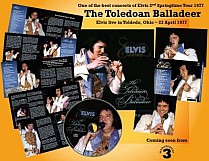 Das inoffizielle Label „Management 3“ hat angekündigt, in Kürze eine neue Bootleg-CD auf den Sammler-Markt zu bringen, die unter dem Titel „The Toledoan Balladeer“ erstmals das vollständige Tourneekonzert von Elvis in Toledo/Ohio am 23. April 1977 enthalten wird. Etwa die Hälfte dieser Show war als Soundboard-Mitschnitt schon im Jahr 1997 als Bonus auf der ebenfalls inoffiziellen Doppel-CD „Goodbye Memphis“ des bekannten Labels „Fort Baxter“ zu finden gewesen. „Management 3“ bringt auf „The Toledoan Balladeer“ jetzt das komplette Konzert als Publikumsmitschnitt in sehr guter Tonqualität und rundet die Veröffentlichung mit einem 12-seitigen Booklet ab. Elvis war am 23. April 1977 vor über 9300 Fans in der ausverkauften „Centennial Hall“ in Toledo/Ohio aufgetreten und hatte dabei ein für 1977er Verhältnisse sehr gutes Konzert absolviert. Datum: 11. Juli 2011 – Quelle: EP Gold |
