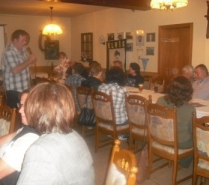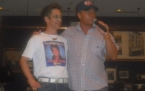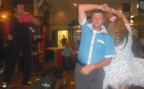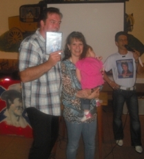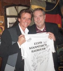 Der Beginn der Sommerferien in Nordrhein-Westfalen und vor allem das leider erneut bescheidene und alles andere als sommerliche Wetter ließen das Team von „The King’s World“ mit etwas Skepsis dem angekündigten „Elvis-Sommerfest 2012“ des „Elvis Circle“ am gestrigen Sonntag, dem 15. Juli 2012, entgegenblicken. Erfreulicher Weise jedoch erwies sich diese Skepsis als unbegründet, denn immerhin mehr als 30 Elvis-Fans aus dem Rheinland, dem Ruhrgebiet und dem Münsterland folgten der Einladung von TKW in die bewährte Location „Zur Postkutsche“ in Datteln. Ihnen wurde ein wieder vielfältiges Programm in Erinnerung an den King geboten, in dessen Mittelpunkt bekannte und auch weniger bekannte Elvis-Videos auf großer Leinwand standen, die viele Besucher oftmals wie gebannt verfolgten. Sehr gut kam beim Publikum auch der zweiteilige Live-Auftritt von Elvis-Interpret Harry Johnson an, der auf sympathisch-natürliche Weise und ohne jegliche Kostümierung große Hits von Elvis wie „Don’t Be Cruel“ und „It’s Now Or Never“ aber auch seltenere Songs des King wie „Girl Next Door Went A’ Walking“ und „Green Green Grass Of Home“ vortrug (oberes Foto). Harry siegte dann auch beim beliebten Elvis-Songquiz und freute sich über seinen Hauptgewinn, eine DVD mit rarem Elvis-Live-Material aus den 70er Jahren (unteres Foto). Empörung herrschte bei ALLEN Besuchern über den skandalösen Elvis-/Linda Thompson-Bericht im Magazin „Freizeit-Revue“, und die öffentliche Protest-Aktion von „The King’s World“ gegen den Artikel, die sich in Datteln wie angekündigt in einer Unterschriftensammlung niederschlug, erfuhr breite Zustimmung und Unterstützung seitens der Fans. Und so herrschte bereits gestern viel Vorfreude auf die nächste Auflage der Veranstaltungsreihe, die im Dezember 2012 traditionsgemäß als „Elvis Christmas Circle“ stattfinden wird. Der genaue Termin und das Programm werden rechtzeitig bekannt gegeben werden. Datum: 16. Juli 2012 |