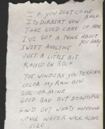 Wieder einmal steht in den USA eine große Versteigerung von wertvollen Memorabilia aus der Rock- und Pop-Musik-Geschichte an, bei der auch viele interessante und teure Stücke aus der Elvis-Historie angeboten werden. Die Veranstaltung gehört zu der Reihe „Rock & Roll Pop Culture Auction“ des in New York City ansässigen Unternehmens „Gotta Have It Collectibles“ und beginnt in knapp einer Woche am Dienstag, dem 24. Juli 2012. Von Elvis werden zahlreiche privat wie beruflich getragene Kleidungsstücke sowie wertvolle Schmuckstücke, Autogramme, Filmplakate und Konzert-Eintrittskarten angeboten. Sehr interessant unter den Elvis-Memorabilia ist auch nebenstehend abgebildete handschriftliche Song-Liste des King für die Aufnahmesession im „Stax-Studio“ in seiner Heimatstadt Memphis im Juli 1973, auf der sich neben bekannten und bei der Session auch verwendeten Liedern wie „Take Good Care Of Her“ und „Raised On Rock“ auch Songs befinden, die für die Session zwar geplant gewesen waren, letztlich aber dann doch nicht aufgenommen worden waren wie „The Wonders You Perform“, „Color My Rainbow“ und „Good Bad But Beautiful“. Das Startgebot für die Song-Liste beträgt 3000,- US-Dollar. Datum: 18. Juli 2012 – Quelle: Gotta Have It Collectibles |