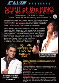 Übertreibt Elvis Presley Enterprises (EPE) das Spiel mit dem Elvis-Imitatoren-Wesen nun endgültig? Nicht wenigen Elvis-Fans speziell aus Europa ist das Ausufern des „Ultimate Elvis Tribute Artist Contest“ in den Monaten vor und an den Tagen während der „Elvis Week 2012“ schon jetzt des Guten zuviel, doch nun haben die Verantwortlichen noch ein weiteres Elvis-Imitatoren-Konzert zum Programm der Gedenkwoche zum 35. Todestag von Elvis ergänzt: Am Freitag, dem 17. August 2012, wird es am späten Abend ab 23.00 Uhr eine Show unter dem Titel „Spirit Of The King“ im „Cannon Center“ in Memphis geben, das direkt auf das zweite Halbfinale der Endrunde des „Ultimate Tribute Artist Contest“ an gleicher Stelle folgen wird. Als Headliner der Show wurden mit Shawn Klush der erste Gewinner des Contest aus dem Jahr 2007 und mit Cody Slaughter der letzte Gewinner aus dem Jahr 2011 und damit amtierende Champion verpflichtet. Der Vergleich Klush vs. Slaughter mag für manche Fans interessant sein; andere dürften über diese Programmergänzung der „Elvis Week“ eher verständnislos den Kopf schütteln. Für Puristen ist bei „Spirit Of The King“ somit die Liste der ‚Special Guests’ am interessantesten, denn mit Back Up-Sängerin Millie Kirkham sowie Gordon Stoker und Ray Walker von Elvis’ 50er und 60er Jahre-Begleitchor „The Jordanaires“ werden drei legendäre frühere Mitstreiter von Elvis mit Gastauftritten bei der Show dabei sein. Datum: 21. Juli 2012 – Quelle: Elvis Presley Enterprises (EPE) |