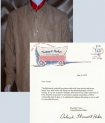 Neben extravaganter Kleidung, auffälligem Schmuck und luxuriösen Automobilen gehörten auch kunstvoll gestaltete Waffen zu den Hobbys von Elvis Presley, und im Laufe seines Lebens erwarb (und verschenkte) der King eine Vielzahl von Schusswaffen. Eine der bekanntesten dieser Waffen steht jetzt in den USA zum Verkauf. Es handelt sich um einen Revolver der bekannten amerikanischen Marke „Smith & Wesson“ vom Typ „357 Magnum“, der von der deutschen Firma „Heym GmbH“ mit einzigartigen Verzierungen versehen worden war (obere Abbildung). Zu der Waffe gehört auch ein Lederholster mit Elvis-Namenszug (untere Abbildung). Elvis hatte den Revolver und das zugehörige Holster am 6. November 1970 im Geschäft „Kerr’s Sporting Goods“ im Los Angeles-Stadtteil Beverly Hills in Kalifornien gekauft und am 1. Dezember 1970 dem seinerzeitigen US-Vize-Präsidenten Spiro Agnew geschenkt. Agnew hatte den Revolver später wieder zurückgegeben, als in anderem Zusammenhang gegen ihn wegen Bestechlichkeit ermittelt wurde. Heute nun werden der Revolver und das Holster von dem Unternehmen „Moments In Time Memorabilia Inc.“ aus Los Angeles im Internet zum Kauf durch den Höchstbietenden angeboten. Datum: 8. Juli 2012 – Quelle: Moments In Time Memorabilia Inc. |