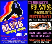 Fernab von Elvis’ Heimatstadt Memphis und unabhängig von Elvis Presley Enterprises (EPE) wird es im Januar 2013 auch eine große Elvis-Geburtstagsfeier in Palm Springs/California geben. Veranstalter und Gastgeber des Events mit dem Titel „Elvis Birthday Tribute“ sind die heutigen Besitzer von Elvis’ früherem Haus in Palm Springs, in dem der King und seine Braut Priscilla im Mai 1967 einen Teil ihrer Flitterwochen verbracht hatten und das heute als „Elvis’ Honeymoon Hideaway“ vermarktet wird. Als Stargäste wurden verpflichtet Tanya Lemani (die „Little Egypt“-Tänzerin aus Elvis’ 1968er Comeback-TV-Special), Rockabilly-Altstar Glen Glenn, der Elvis-Imitator Chris Luna und die „TCB Flash Band“ sowie die Priscilla Presley-Imitatorin Darling Presley. Neben Live-Musik und einem Meet & Greet mit den Stargästen gehören auch Führungen durch das Haus und eine Elvis-Geburtstagstorte zum Programm des „Elvis Birthday Tribute“ im „Honeymoon Hideaway“, der am 5. Januar 2013 von morgens bis in die Abendstunden dauern wird. Datum: 29. Dezember 2012 – Quelle: Elvis’ Honeymoon Hideaway |