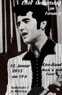 Nicht nur in den USA, in Australien und in mehreren europäischen Ländern wird wie von uns berichtet rund um den 8. Januar 2013 der 78. Geburtstag von Elvis Presley gefeiert werden sondern auch in Deutschland. Leider fällt dabei das Angebot hierzulande ein wenig bescheiden aus. So wird es in der deutschen Elvis-Stadt Bad Nauheim kein zentrales Elvis-Festival der „Bad Nauheim-Stadtmarketing GmbH“ mehr geben sondern lediglich Einzel-Veranstaltungen privater Anbieter an den Tagen vor Elvis’ Geburtstag wie diverse Imitatoren-Konzerte mit Oliver Steinhoff („Trinkkuranlage“, Samstag, 5. Januar 2013, 19.00 Uhr), Rio („Fortbildungszentrum der Landesärztekammer“, Samstag, 5. Januar 2013, 20.00 Uhr) und Shaky Everett („Theater am Park“, Sonntag, 6. Januar 2013, 15.00 Uhr) sowie die Führung „Auf den Spuren von Elvis“ mit Zeitzeuge Hans-Ulrich Halwe (beginnend an der Tourist-Information, Samstag, 5. Januar 2013, 14.00 Uhr). Vielversprechend klingt in der Vorankündigung das Event „Elvis Geburtstag im Forum 2“ (s. Plakat), das am Samstag, dem 12. Januar 2013, in der bayrischen Metropole München über die Bühne gehen wird. Das Programm der Veranstaltung besteht aus einer Filmvorführung des Elvis-Spielfilms „Girl Happy“ aus dem Jahr 1965 in der deutschen Fassung „Kurven-Lilly“ auf Kinoleinwand, einem Live-Konzert der Elvis-Cover-Band „Rock’n’Roll Fever“, einem Imbiss-Buffet und einer Elvis-Fanartikel-Börse. Ort des Geschehens ist die Location „Forum 2“ in der Nadistraße 3 in 80809 München. Die Veranstaltung beginnt um 19.00 Uhr, und der Eintritt kostet lediglich 10,- Euro, wobei das „Forum 2“ auch ein Familienticket für 4 Personen zum Preis von nur 29,- Euro anbietet. Datum: 30. Dezember 2012 – Quellen: Bad Nauheim-Stadtmarketing GmbH, Forum 2 |