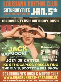 Zusätzlich zu den bereits vorgestern von uns an dieser Stelle angekündigten Elvis-Geburtstagsfeiern in Deutschland – genauer gesagt in Bad Nauheim und in München – wird es auch in der deutschen Bundeshauptstadt Berlin eine Veranstaltung zur Würdigung des 78. Geburtstages des King geben. Das Event trägt den ideenreichen und ungewöhnlichen Titel „Memphis Flash Birthday Bash“ und spielt damit auf einen von mehreren Spitznamen an, die dem ganz jungen Elvis Presley zu Beginn seiner einzigartigen Karriere verpasst wurden, nämlich „Memphis Flash“. Stargast der Veranstaltung ist der in Skandinavien sehr bekannte und erfolgreiche Elvis-Interpret Jack Baymoore aus Schweden, der nicht zum ersten Mal anlässlich einer Elvis-Geburtstagsfeier in Berlin zu Gast ist. Im Vorprogramm spielen Joey JB Carter sowie die Berliner Lokalmatadoren „Ike & The Capers“, ein Trio, das mit einem wunderbar authentischen Sound die frühen Songs von Elvis und seinen ersten Musikern Scotty Moore (Gitarre) und Bill Black (Bass) aus den Jahren von 1954/55 wieder aufleben lässt. Dazu gibt es eine Elvis-Rock’n’Roll-Disco. Der „Memphis Flash Birthday Bash“ wird präsentiert vom „Louisiana Rhythm Club“ und findet statt am Samstag, dem 5. Januar 2013, ab 21.00 Uhr im „Roadrunner’s Paradise Rock & Motor Club“ in der Saarbrücker Str. 24 in 10405 Berlin. Datum: 1. Januar 2013 – Quellen: Louisiana Rhythm Club, Roadrunner’s Paradise Rock & Motor Club |