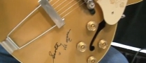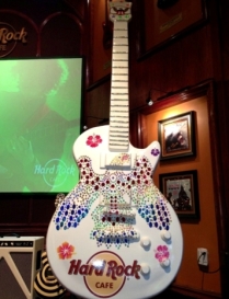 Hoch her im wahrsten Sinne des Wortes ging es in der Silvesternacht in der Niederlassung der weltbekannten Musik-Restaurant-Kette „Hard Rock Café“ in Elvis Presleys Heimatstadt Memphis/Tennessee. Im Rahmen des schon traditionellen „New Year’s Eve Guitar Drop“ präsentierte die Location eine überdimensionale „Elvis Presley Aloha From Hawaii-Gitarre“. Die zehn Fuß (= über drei Meter!) hohe Gitarre war im Design des berühmten „Aloha Eagle Suit“ gestaltet worden, des reich verzierten weißen Kostüms also, das Elvis während seines über Satellit live übertragenen Fernsehkonzertes „Aloha From Hawaii“ am 14. Januar 1973 im „International Center“ in Honolulu/Hawaii getragen hatte. Die von Elvis Presley Enterprises (EPE) unterstützte Präsentation der Riesen-Gitarre im „Hard Rock Café Memphis“ (s. Foto) und deren folgende feierliche Aufstellung vor der Location auf der Beale Street um Mitternacht in der vergangenen Neujahrsnacht war der Höhepunkt der großen Silvesterparty in Memphis’ „Hard Rock Café“, die bereits um 17.00 Uhr mit Live-Musik diverser Bands begonnen hatte und die bis in die frühen Morgenstunden des heutigen 1. Januar 2013 andauerte. Datum: 1. Januar 2013 – Quellen: Hard Rock Café Memphis, Elvis Presley Enterprises (EPE) |