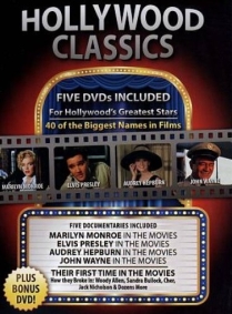 Ende des vergangenen Jahres 2012 ist in Europa eine neue 5-DVD-Box auf den Markt gebracht worden, die den Titel „Hollywood Classics“ trägt. Das Produkt fasst fünf bereits bekannte Dokumentationen über legendäre und weltberühmte Filmstars aus Hollywood in einem neuen Gesamt-Set zusammen, darunter auch die schon als Einzel-DVD erhältliche Dokumentation „Elvis Presley In The Movies“. Weitere Bestandteile der Box sind die Dokumentationen „Marilyn Monroe In The Movies“, „Audrey Hepburn In The Movies“, „John Wayne In The Movies“ und „Their First Time In The Movies“. In letzterer werden weitere große Leinwandidole und ihre Anfänge in Hollywood portraitiert wie Woody Allen, Jack Nicholson, Cher, Goldie Hawn, Sandra Bullock und andere. Jede der fünf Einzel-Dokumentationen hat eine Länge von 45 Minuten und ist nur in englischer Sprache verfügbar. Präsentiert werden die Dokumentationen von dem bekannten Filmkritiker Timothy Knight. Das neue 5-DVD-Set „Hollywood Classics“ kommt von einem Unternehmen namens „Music Video Distributors“ und kostet im Fachhandel je nach Händlerangebot lediglich um die 10,- Euro. Datum: 3. Januar 2013 – Quellen: Music Video Distributors, CD Universe |