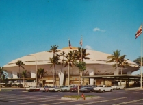 Hallenaufbau und Proben im „International Center“... und zweimal ausverkauftes Haus Heute vor 40 Jahren, am Donnerstag, dem 11. Januar 1973, wurde es für alle Beteiligten am „Aloha From Hawaii“-Projekt langsam ernst. Ab dem frühen Morgen erfolgte in der Location des Mega-Events, dem „International Center“ in Honolulu (oberes Foto), der Aufbau der Bühne, der Sound- und Lichttechnik und des Equipements des Fernsehteams und von Elvis’ Plattenfirma „RCA“. Produzent Marty Pasetta wusste, dass Elvis sich weniger als sonst bewegen wird, um nicht die fremden asiatischen Kulturen an den Fernsehschirmen womöglich mit irgendeiner ‚falschen’ Pose oder Geste zu brüskieren. Gleichzeitig war er von Elvis’ stets hautnahem Kontakt zu seinem Publikum fasziniert. Folglich bestand sein Konzept für die Fernseh-Show darin, durch eine ausgeklügelte Lightshow die mangelnde körperliche Action von Elvis etwas auszugleichen und dazu Elvis’ direkten Kontakt zu den Fans in der Halle dadurch hervorzuheben, dass er dem King in der Bühnenmitte eine mehrere Meter lange Rampe baute, über die Elvis regelrecht in die Menschenmenge hineinwandern konnte. Das Problem bei alledem war freilich, dass die Rampe und auch das gewaltige Equipement des mit 5 Kameras agierenden Fernsehteams und des Aufnahmeteams von „RCA“, das das Konzert live mitschnitt, derart viel Platz verschlangen, dass von den eigentlich 8400 Sitzplätzen im 1964 erbauten „International Center“ nur noch 6000 für das Konzert genutzt werden konnten. Umso mehr hatten sich die Eintrittskarten für das Spektakel in rasendem Tempo verkauft, und beide Shows, sowohl das vor Publikum stattfindende Generalproben-Konzert als auch das eigentliche TV-Konzert, waren bis auf den letzten Platz gefüllt. Da die gesamten Ticketeinnahmen in Höhe von 75 000,- Dollar dem „Kui Lee Cancer Fund“ gestiftet wurden, war neben Elvis auch der 1966 an Krebs gestorbene hawaiianische Künstler Kuiokalani Lee auf den Eintrittskarten abgebildet (mittlere Abbildung) – eine schöne Geste und zugleich ein Novum in der Elvis-Geschichte. Am Abend des 11. Januar 1973 waren alle technischen Vorbereitungen im „International Center“ abgeschlossen, und so konnten Elvis und seine komplette Besetzung zwischen 19.00 und 22.00 Uhr noch einmal drei Stunden lang intensiv für die Show proben (unteres Foto). Es war angerichtet für „Elvis Aloha From Hawaii Via Satellite“! (Fortsetzung folgt). Datum: 11. Januar 2013 – Quellen: Diverse |
