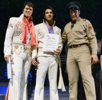 Die „Elvis Week 2013“ zum 36. Todestag des King in Memphis und damit auch die große Endrunde des umstrittenen aber gleichzeitig auch immer sehr gut besuchten „Ultimate Elvis Tribute Artist Contest“ rücken näher, und dementsprechend hart umkämpft sind die letzten Vorrundenwettbewerbe, bei denen sich noch Teilnehmer mit einem Sieg für diesen weltgrößten Elvis-Imitatoren-Wettstreit qualifizieren können. Beim Vorrunden-Contest im Hotel-Casino-Komplex „Bally’s“ in Atlantic City/New Jersey, der wie angekündigt am vergangenen Samstag, dem 15. Juni 2013, stattgefunden hat, war Matt Cordell der Glückliche, der den Sieg und damit die Qualifikation schaffte. Cordell (auf nebenstehendem Foto in der Mitte) gewann bei der von „Legends In Concert“ organisierten Veranstaltung vor Brycen Katolinsky (Foto links) und Jason Baglio (Foto rechts). Katolinskys Lächeln wirkte dabei etwas gequält, denn als Zweitplatzierter hatte der junge Mann die Qualifikation für die Endrunde in Memphis ähnlich knapp verpasst wie zuvor schon beim Vorrundenwettbewerb im Rahmen des „Tupelo Elvis Festival“ in Elvis’ Geburtsort Tupelo/Mississippi, wo Katolinsky Dritter geworden war. Datum: 19. Juni 2013 – Quelle: Legends In Concert |