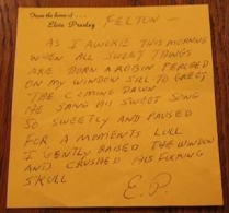 Bereits im April 2013 ist zunächst praktisch unbemerkt von der Elvis-Welt ein neuer Gedichtband in den USA erschienen, der den ungewöhnlichen und originell klingenden Titel „Elvis Presley’s Hips & Mick Jagger’s Lips“ (dt. „Elvis Presleys Hüften & Mick Jaggers Lippen“... reimt sich im Deutschen leider nicht wie im Englischen!) trägt. Das Buch wurde geschrieben von der bekannten amerikanischen Schriftstellerin Susana H. Case aus New York City, die in „Elvis Presley’s Hips & Mick Jagger’s Lips“ eine abwechslungsreiche und unterhaltsame Sammlung von Gedichten präsentiert, in denen große Stars der Rock- und Pop-Musik sowie bekannte Lieder der modernen Musik-Geschichte und deren Texte thematisiert werden. Neben Entertainment-König Elvis Presley und „Rolling Stones“-Frontmann Mick Jagger, die die Autorin offenbar besonders interessant findet, kommen auch noch etliche andere legendäre Musik-Stars in den Gedichten vor wie die „Beatles“, „Pink Floyd“, Bob Dylan und Jimi Hendrix. Unterteilt sind die Gedichte dabei in die drei Rubriken „The Honey Thing“, „Mood Alteration“ und „Do A Song About It“. Die Gedichtsammlung „Elvis Presley’s Hips & Mick Jagger’s Lips“ von Susana H. Case ist Mitte April 2013 beim amerikanischen Verlag „Anaphora Literary Press“ mit Sitz in Tucson/Arizona publiziert worden. Sie ist als Taschenbuch mit einem Umfang von 82 Seiten aufgemacht und im internationalen Buchhandel unter den ISBN-Nummern 10:193753636X und 13:978-1937536367 registriert. Der Ladenpreis des nur in englischer Sprache erhältlichen Werkes beträgt 15,- US-Dollar (= ca. 11,55 Euro nach heutigem Kurs). Datum: 30. Juni 2013 – Quelle: Anaphora Literary Press |
