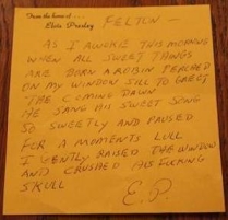 Liebe Elvis-Fans, wir bitten Sie um Verständnis, glauben aber zugleich, auch in Ihrem Sinne zu handeln, wenn wir entschieden haben, mit Ausnahme der Fortsetzung unserer täglichen „Aloha“-Sonderserie am heutigen Tage keine weiteren Elvis-News an dieser Stelle zu publizieren. Berichte z. B. über wertlose neue Elvis-Billig-CDs oder irgendwelche Elvis-Imitatoren-Shows würden unserer Überzeugung nach im Moment völlig unangemessen sein, weswegen wir es vorziehen, den Rest des Tages der stillen Trauer um John Richard Wilkinson zu überlassen... Datum: 12. Januar 2013 – Foto-Quelle: Fanclub „Elvis Matters“ |