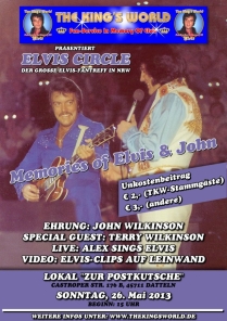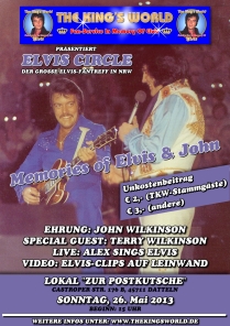 Die Leitung von „The King’s World (TKW)“ freut sich, den ersten diesjährigen Termin unserer beliebten Veranstaltungsreihe „Elvis Circle“ bekannt geben zu können. So wird der nächste Fantreff „Elvis Circle“ als „Elvis-Frühlingsfest“ am Sonntag, dem 21. April 2013, stattfinden. Location wird natürlich wieder der Saal des bewährten Lokals „Zur Postkutsche“ in Datteln bei Recklinghausen sein. Das genaue Programm und die Gäste werden rechtzeitig bekannt gegeben werden. Der „Elvis Circle“ von „The King’s World“ in Datteln, ursprünglich vom ortsansässigen Elvis-Fan-Urgestein Horst Gerwerth ins Leben gerufen, findet dreimal pro Jahr statt und ist bei freiem Eintritt eine sehr beliebte und gut besuchte Veranstaltungsreihe mit Elvis-Videos auf Leinwand, Live-Musik von Elvis-Interpreten, interessanten Interview-Gästen aus der Elvis-Szene und einem reichhaltigen Angebot von Elvis-Fanartikeln. Datum: 21. Januar 2013 |