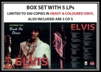 Auf dem Elvis-Sammlermarkt ist an diesem Wochenende die angekündigte Box „Back On Stage – Las Vegas 1970“ des inoffiziellen Labels „Pin Up Records“ erschienen. Das Set enthält professionelle Live-Aufnahmen von Elvis’ zweitem Gastspiel im „International Hotel“ in Las Vegas im Januar/Februar 1970, und zwar die Opening Show vom 26. Januar, die Closing Show vom 23. Februar und Ausschnitte aus weiteren Shows zwischen dem 15. und 19. Februar 1970. Die Aufnahmen werden auf fünf farbigen Vinyl-LPs und parallel dazu auf drei inhaltsgleichen CDs präsentiert. Das gesamte Material ist bereits von diversen früheren Veröffentlichungen auf offiziellen wie inoffiziellen Tonträgern bekannt. Elvis hatte bei seinem zweiten Las Vegas-Gastspiel nach dem großen Comeback von 1969 insgesamt 57 hervorragende Konzerte zwischen dem 26. Januar und dem 23. Februar 1970 im „International Hotel“ absolviert, die ebenso alle restlos ausverkauft waren wie die ebenfalls 57 Shows des Premieren-Gastspiels nur vier Monate zuvor im Juli/August 1969. Datum: 23. Juni 2013 – Quelle: Elvis On CD |